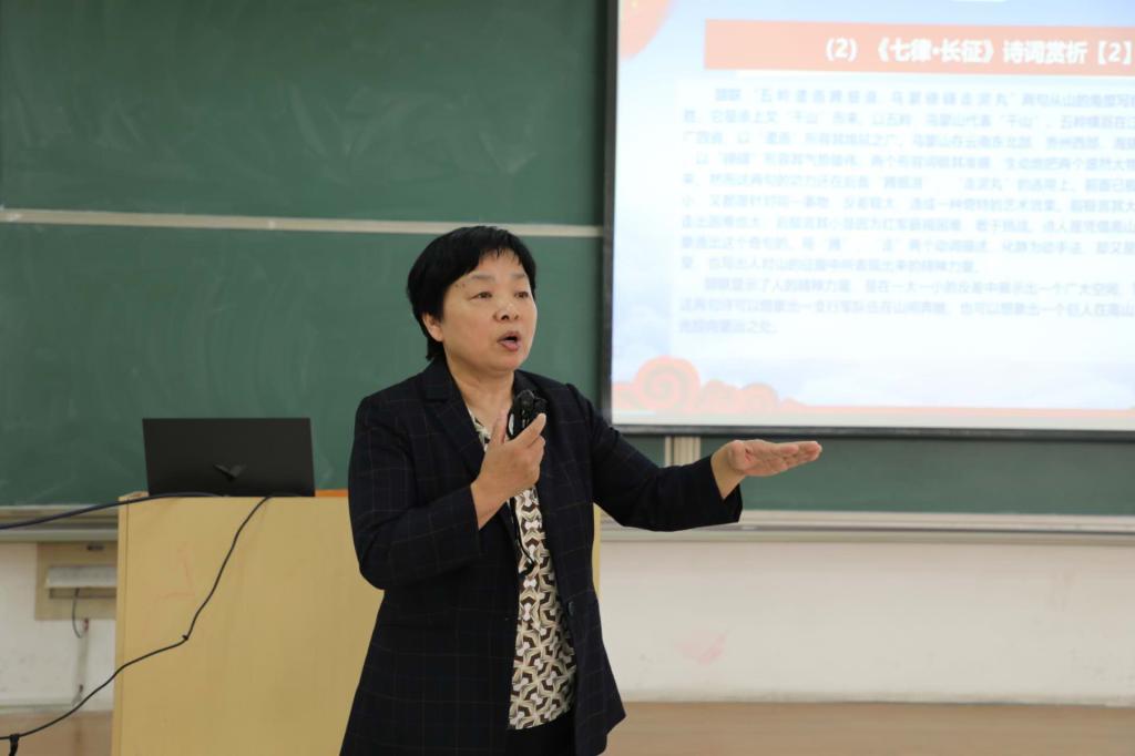 培训过程中,马老师首先介绍了毛泽东的生平以及毛主席诗词的地位,简述了新民主主义革命的发展历程,按照时间顺序依次介绍了土地革命阶段、抗日战争时期、解放战争和新中国诞生时期,引出《西江月·井冈山》《七律·长征》等作品的写作背景、诗词赏析,回顾了当时的斗争状况和伟人情怀,歌颂了革命者不畏艰险、英勇顽强的革命英雄主义和革命乐观主义精神。马老师不仅强调了学习伟大建党精神、长征精神和抗战精神的重要性,也希望同学们能够从中汲取力量,成为担当民族复兴大任的时代新人。