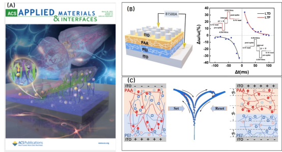 近期,国际知名期刊ACS Applied Materials & Interfaces以封面论文在线发表了由我院赵金石教授团队撰写的题为“Polyelectrolyte Bilayer-Based Transparent and Flexible Memristor for Emulating Synapses”的研究论文(图1A)。论文提出了一种基于高分子电解质双层薄膜结构的新型有机柔性忆阻器,器件不仅具有透光性且阻变性能优秀(图1B)。器件的主功能层是在室温条件下使用水溶液旋涂制备的,具有低成本、环保的优势。因此,有利于应用在神经突触模拟的相关研究,且实现了在增强和抑制过程中都具有长时记忆和短时记忆的行为。该项研究为忆阻器及神经突触模拟研究提供了一种新的思路(图1C),对有机忆阻器的开发及在神经突触模拟相关研究中具有深远意义。