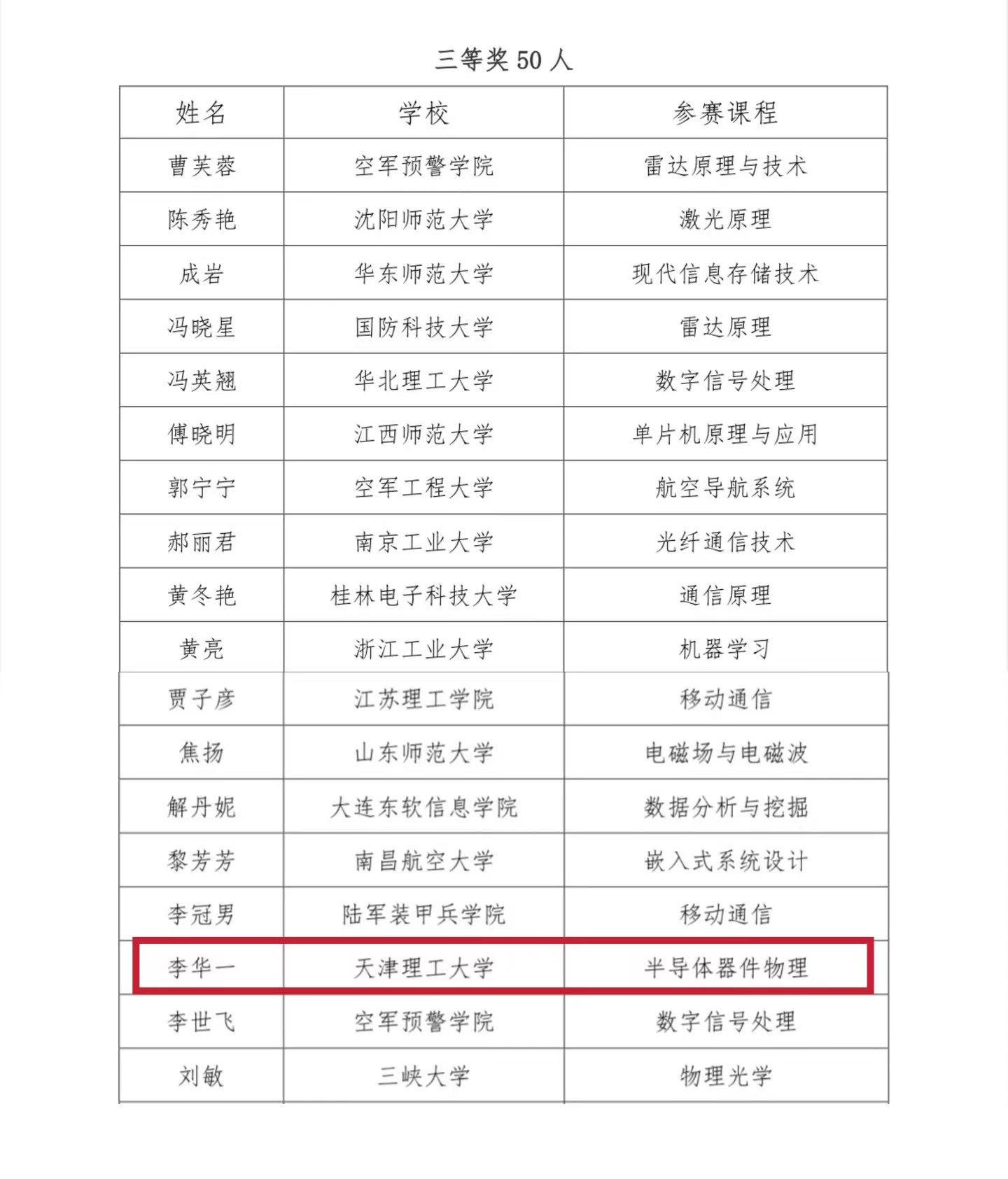 10月21日,全国高等学校电子信息类专业青年教师授课竞赛组委会发布《关于第七届全国高等学校电子信息类专业青年教师授课竞赛决赛结果公示》,我校伟德国际victor·1946源自教师李华一荣获三等奖。