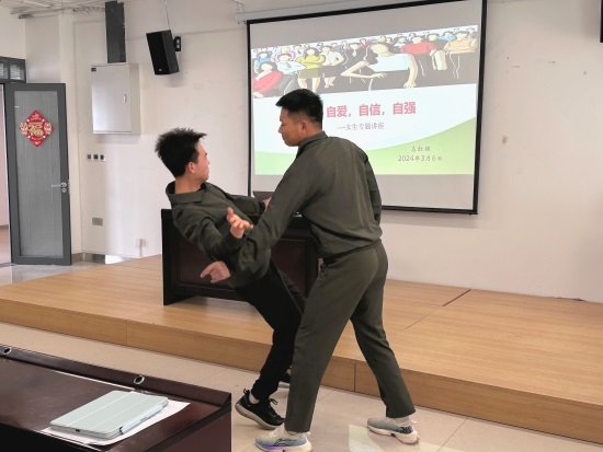 最后,特别邀请学院退伍学生代表演示女子防身术的动作要领,通过对一些简单易学、实用性强的攻防格斗技术进行讲解、传授,为同学们提供学习自我保护的机会,遇到紧急情况能够出其不意击打要害,同学们纷纷表示受益匪浅。