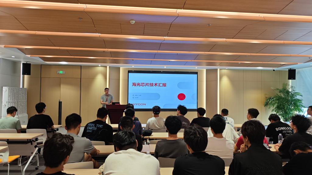 参观结束后,中科曙光公司海光通信业务部天津区域总监朱玉为师生带来专题讲座。他结合企业实际案例,详细介绍了曙光从初创至今的发展历程,分享了企业在高端芯片研发等领域的突破性成果,以及当前国产半导体产业链面临的机遇与挑战。学生们也积极提问,围绕专业学习与职业发展,向专家请教行业前沿知识与就业方向,现场氛围热烈。