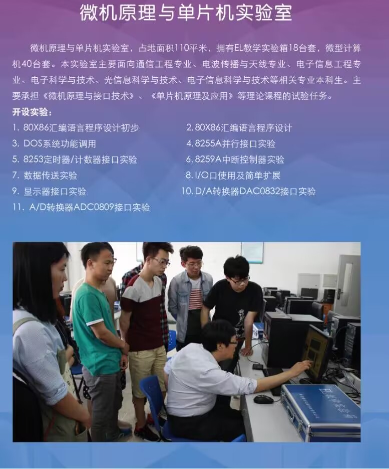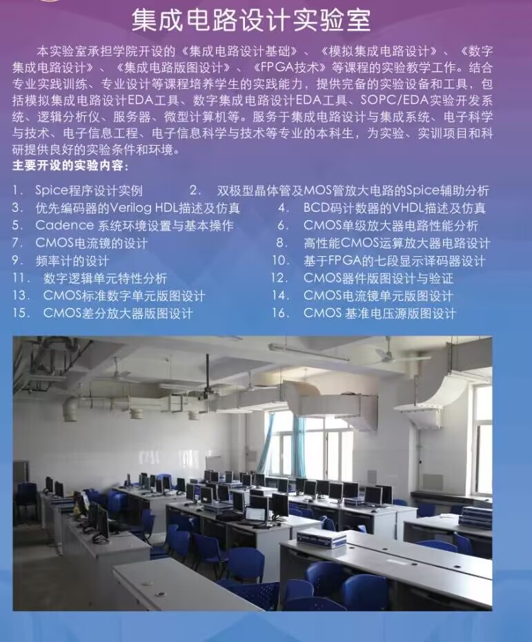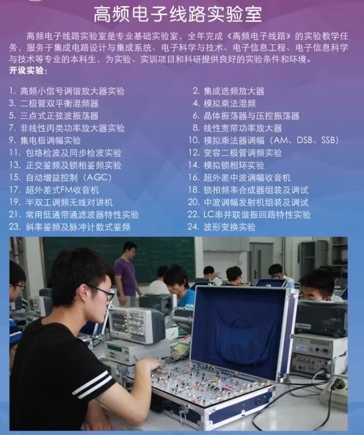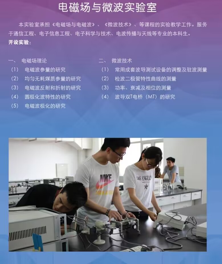 电子科学与技术实验中心中心包括:信号与系统、高频与通信技术、传感与测量、光电器件与光学、微波与电磁场等11个本科实验室,占地2000余平米。